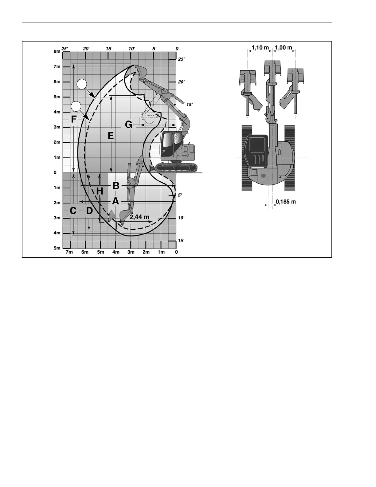 D. (Maximum digging depth over a length of 2.44 m) (8 ft.) .............................. 3.40 m (11 ft. 2 in) maximum offset