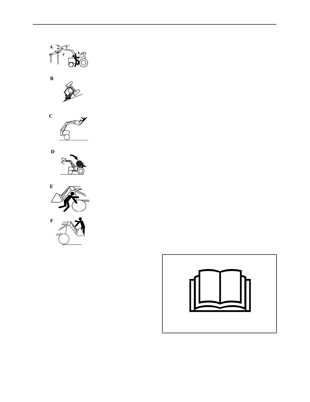 E. Pinch risk. Never stand between the front of the loader and the cross--tube