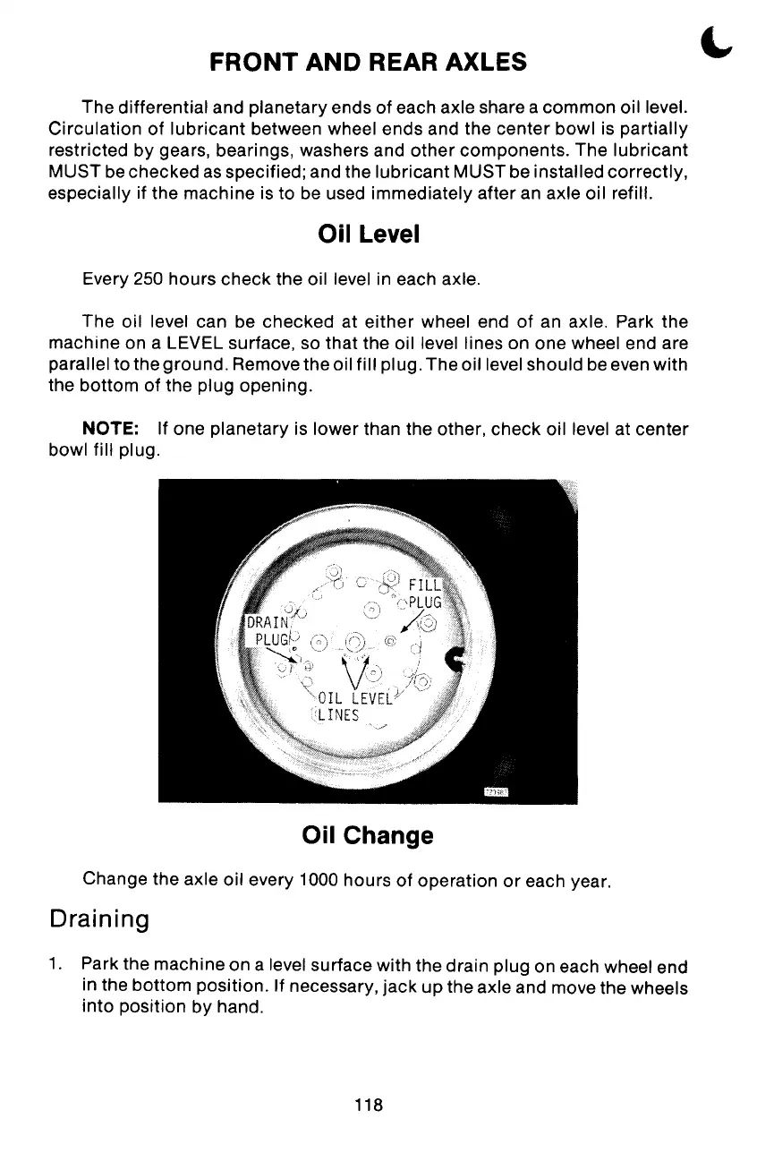 1. Park the machine on a level surface with the drain plug on each wheel end