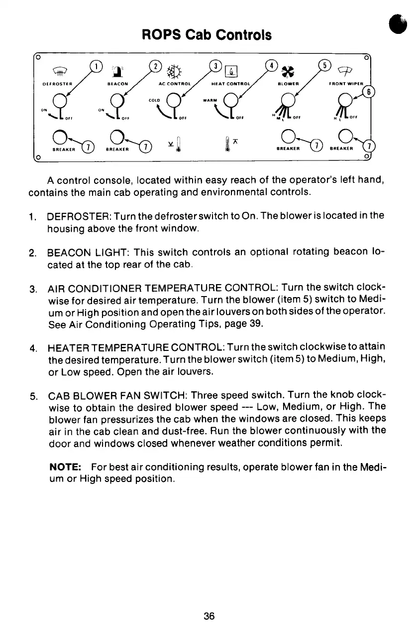 5. CAB BLOWER FAN SWITCH: Three speed switch. Turn the knob clock-