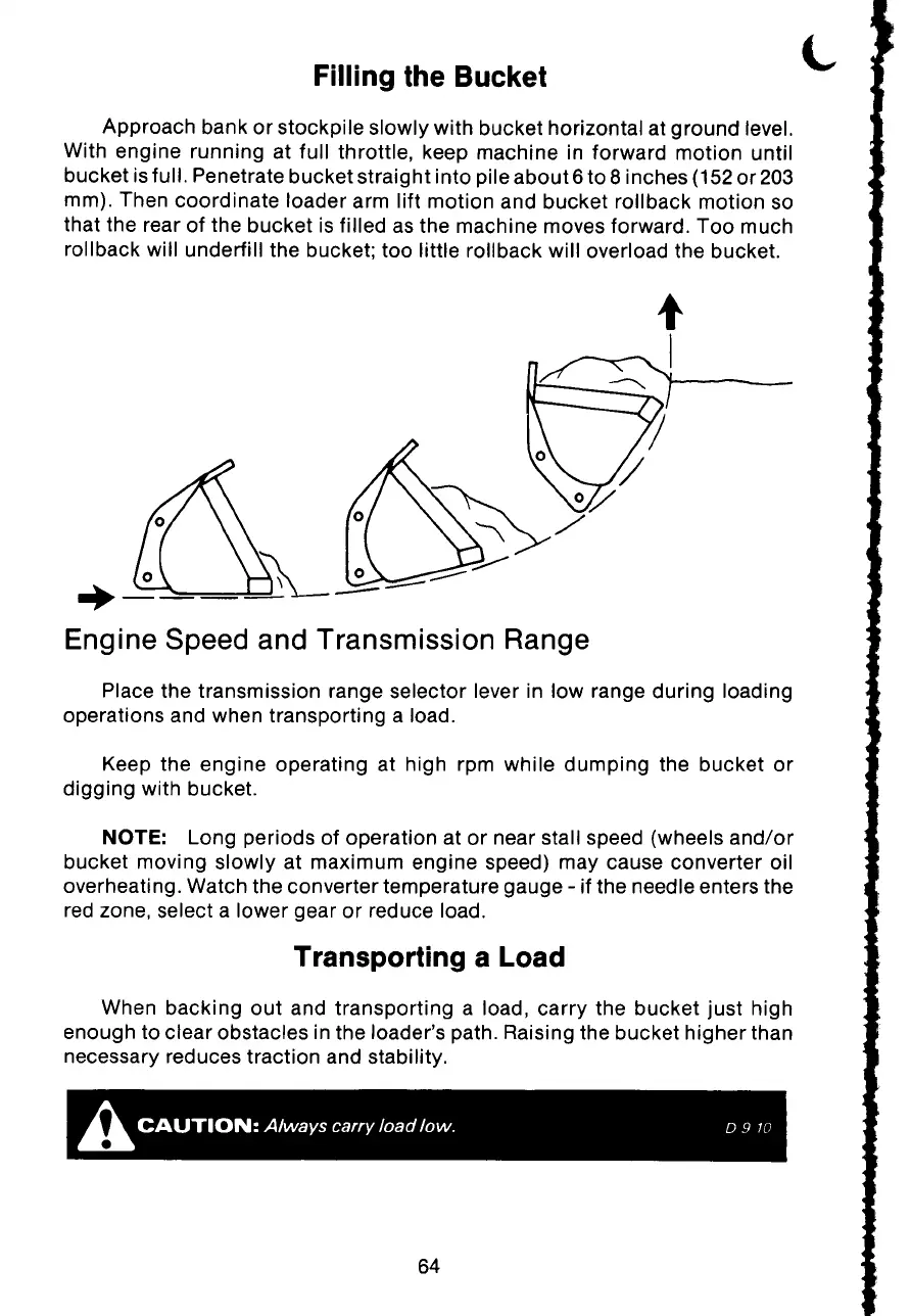 that the rear of the bucket is filled as the machine movesforward. Too much