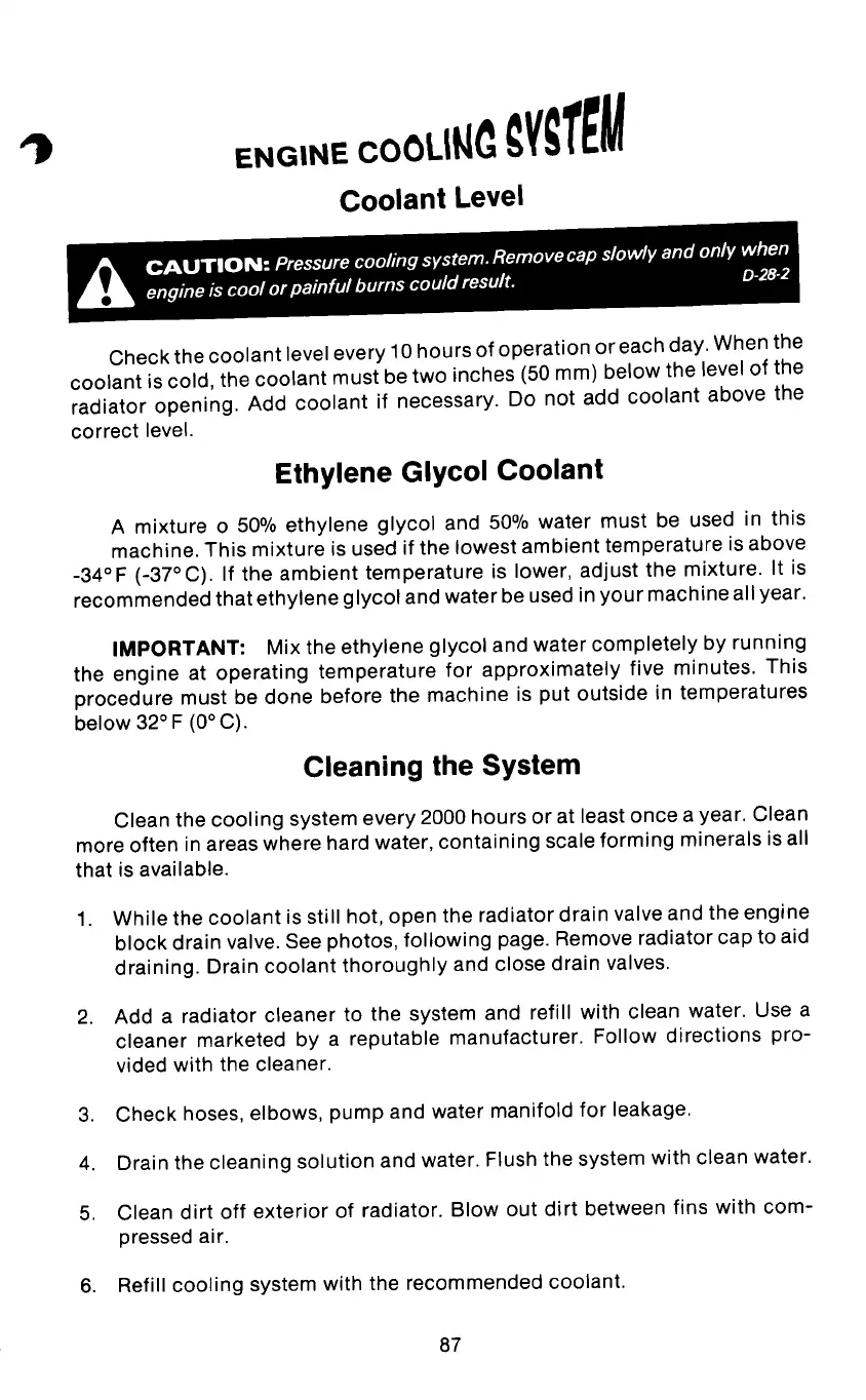 Check the coolant level every 10 hours of operation oreach day. When the