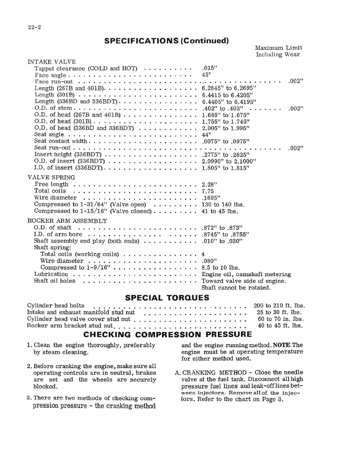 Case W9 - Intake Valve Specifications; Checking Compression Pressure