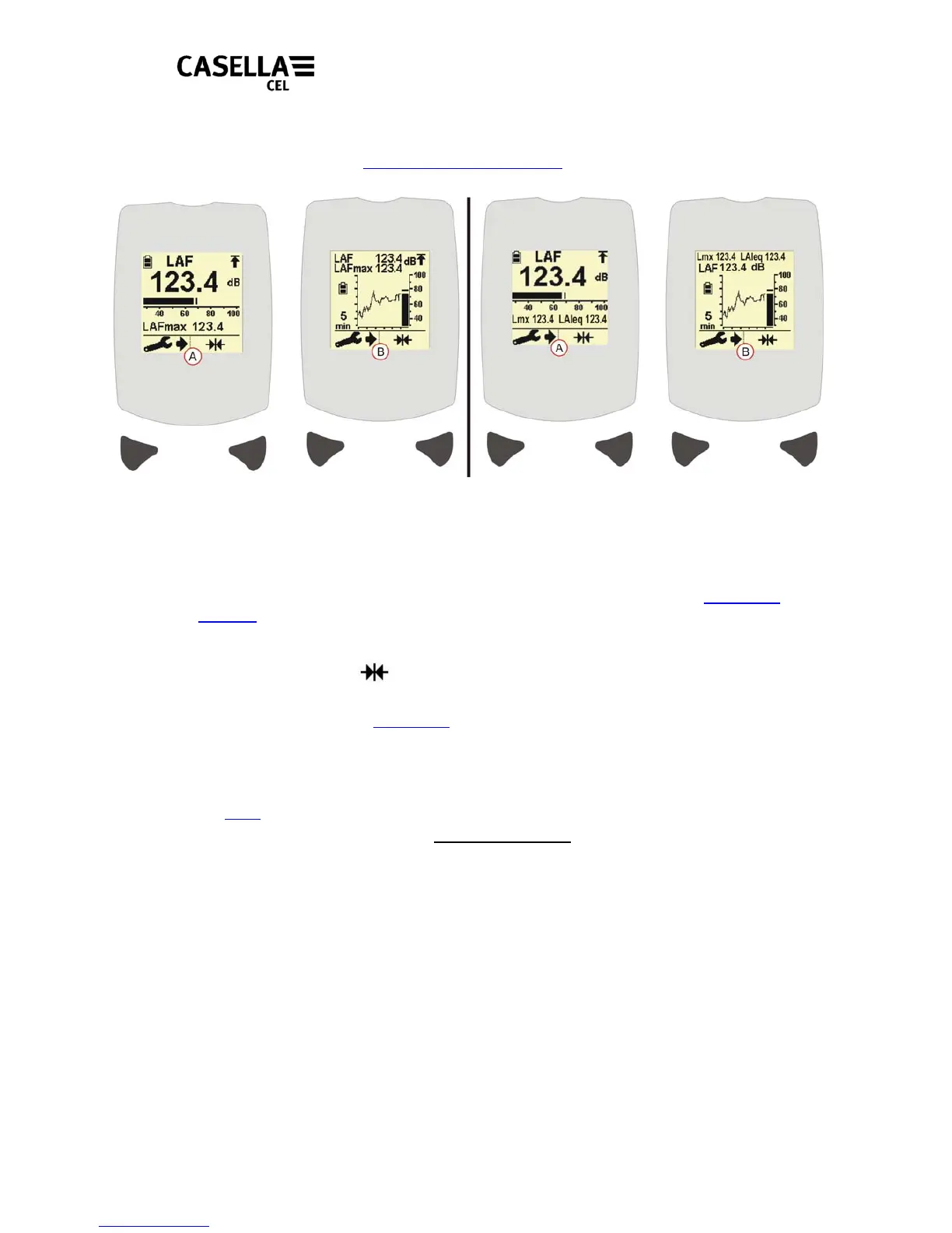 5. The screen will display the instantaneous and maximum sound pressure levels