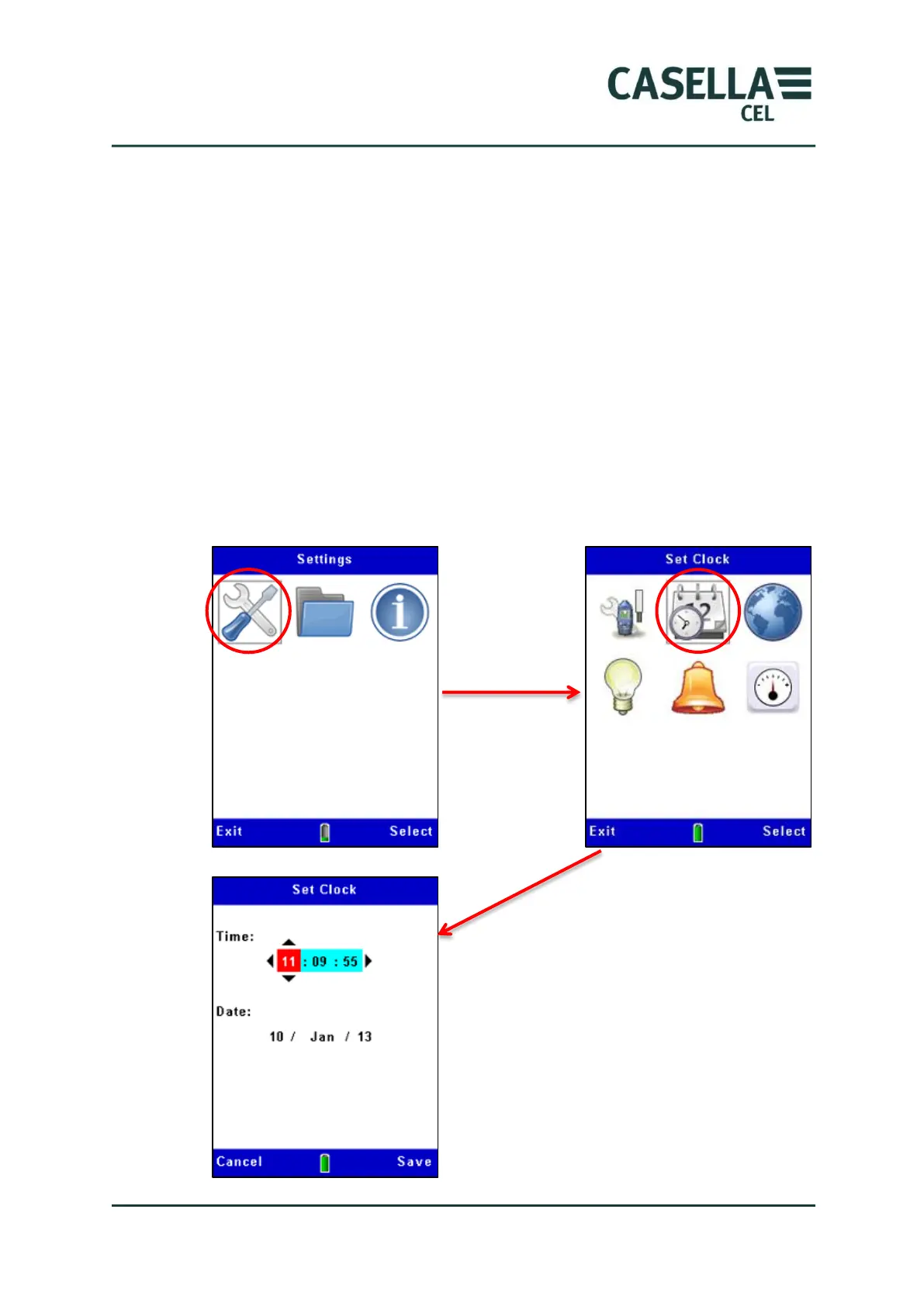 2. Figure 8 shows how to set the time and the date. Press the Save soft