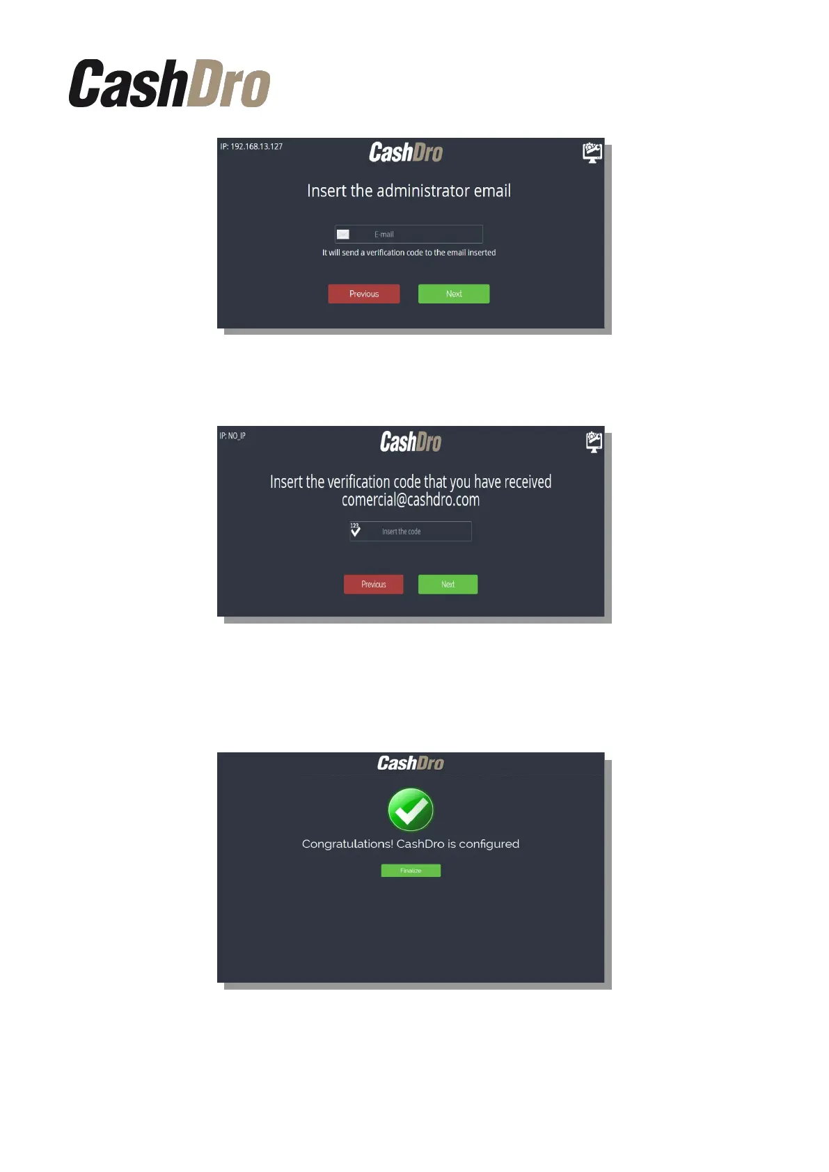 After the verification code is introduced, CashDro3 will initialize the devices and internal CPU