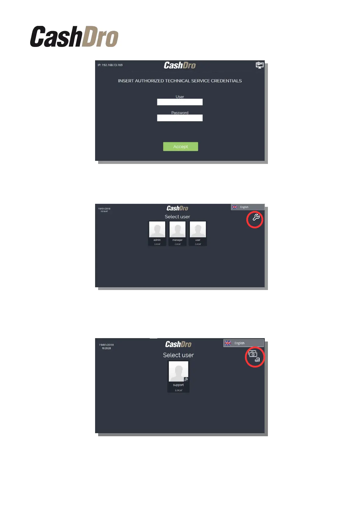 To access to technical users, press on the top-right corner icon. Pressing again in the same