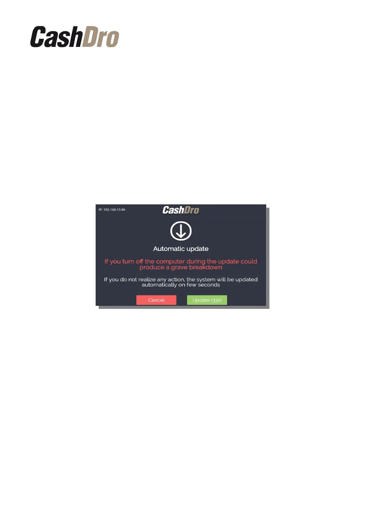 The update screen appears again each time you turn on CashDro3 until update is done.