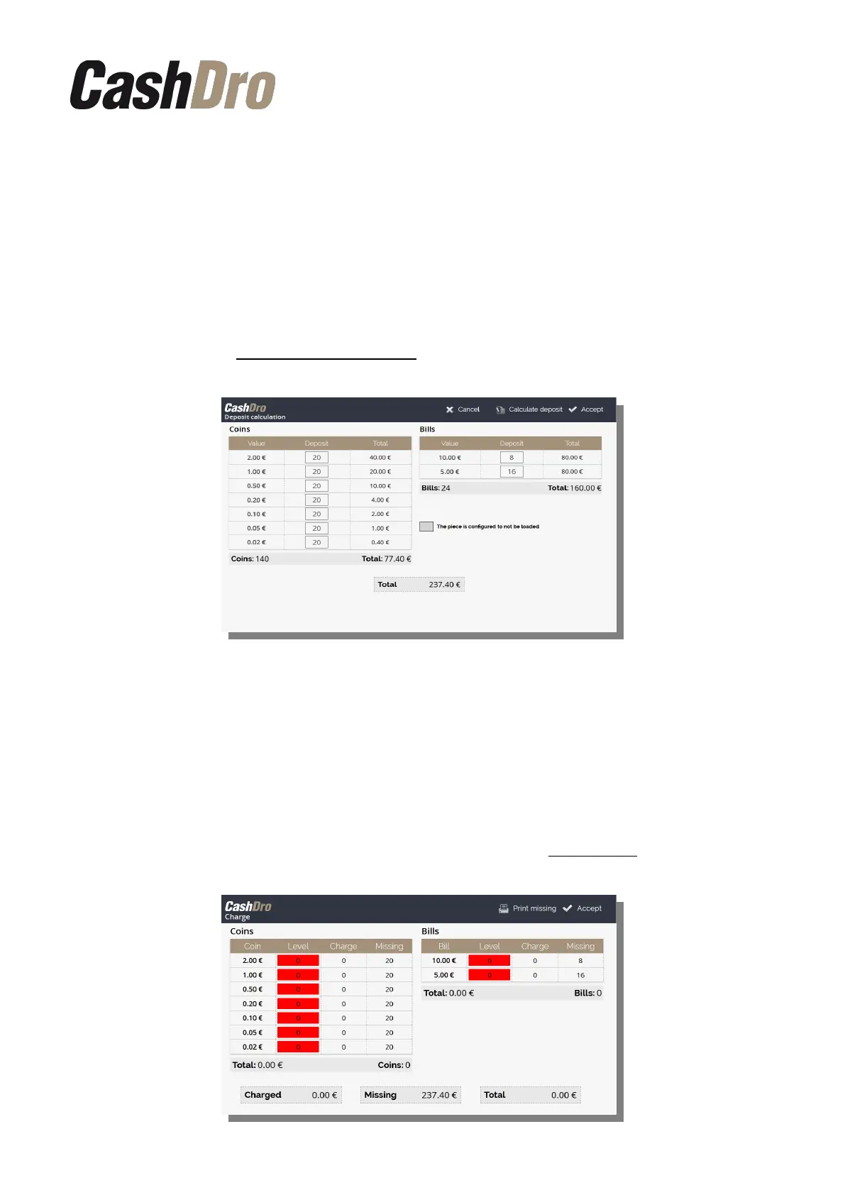 Once the Deposit is set up we can charge cash to CashDro3 for a first time. For this go to