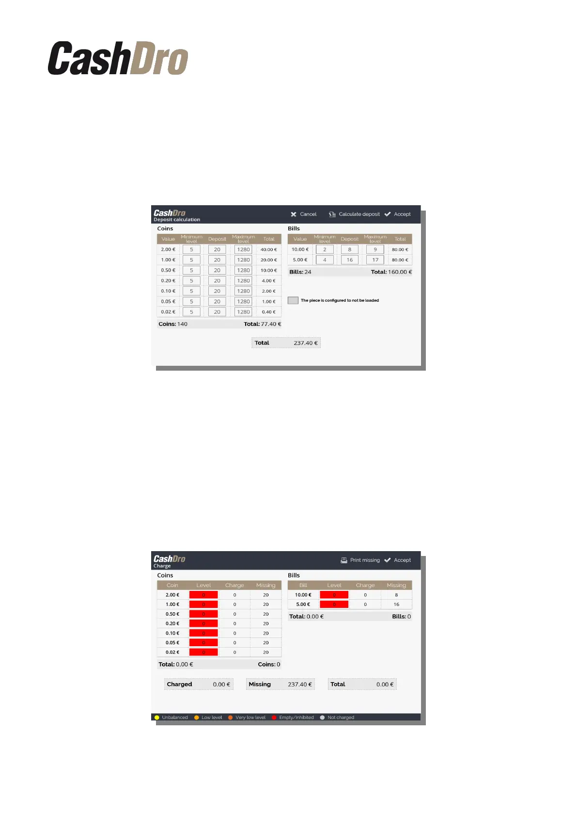 Operation to charge cash in CashDro3. We can visualize the actual “Level”, the “charge”