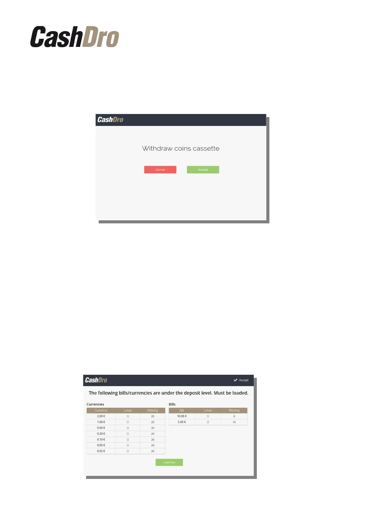 Finally, CashDro3 shows the Charge screen to replenish all levels that are under