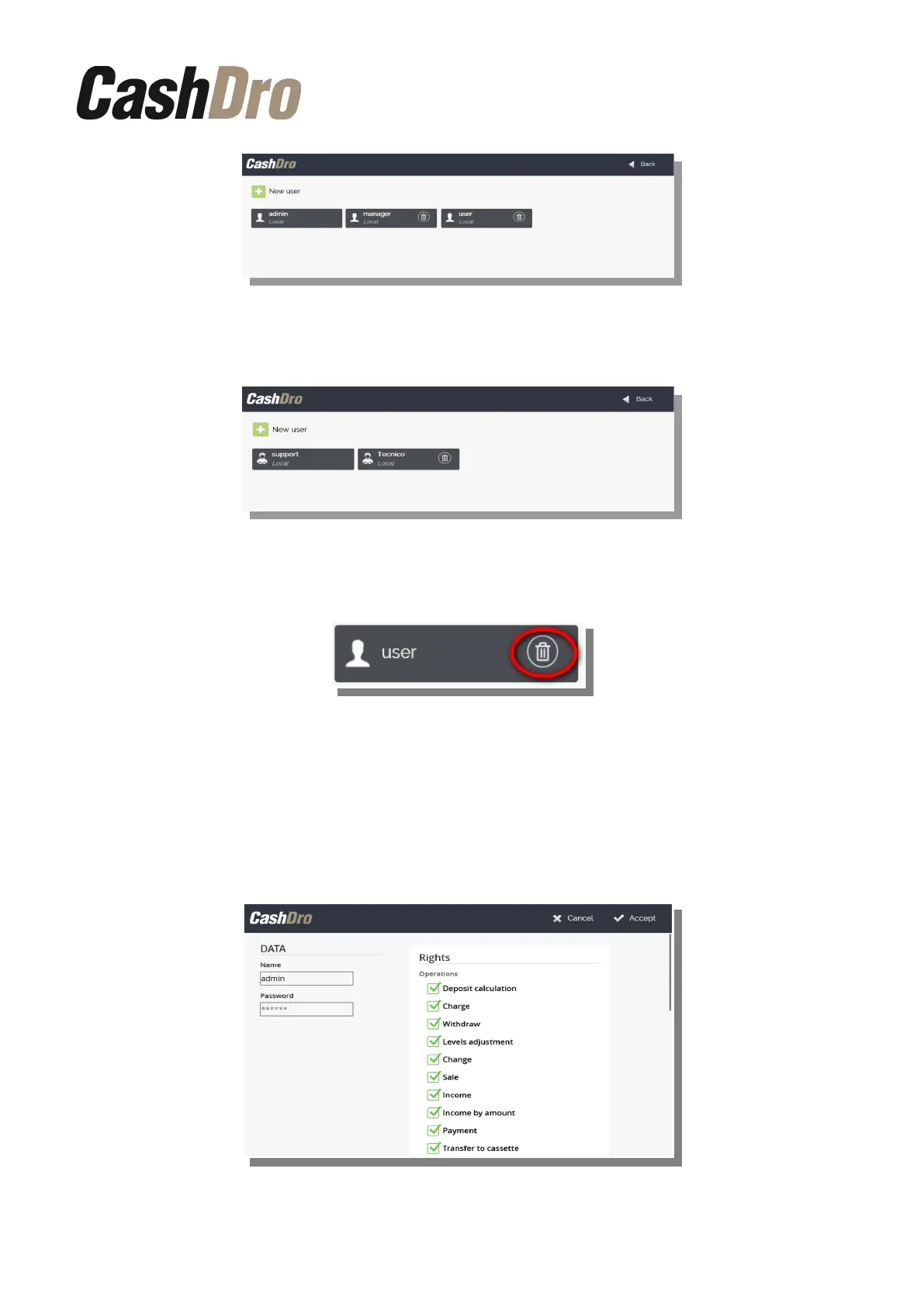 In order to delete a user, push the recycle bin icon in the user list screen.