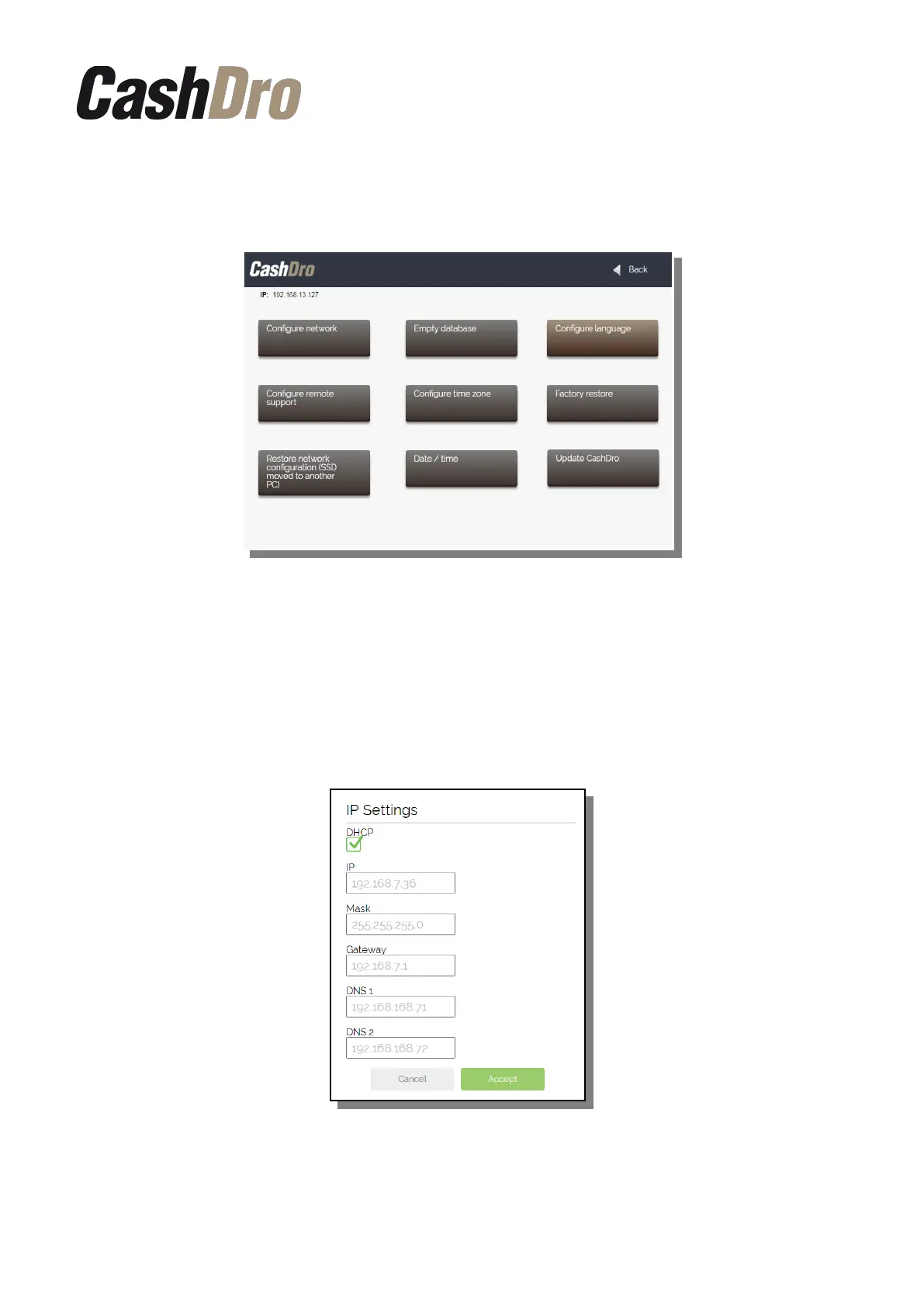 It is recommended to assign to CashDro3 a fixed IP once it is connected in its final location.