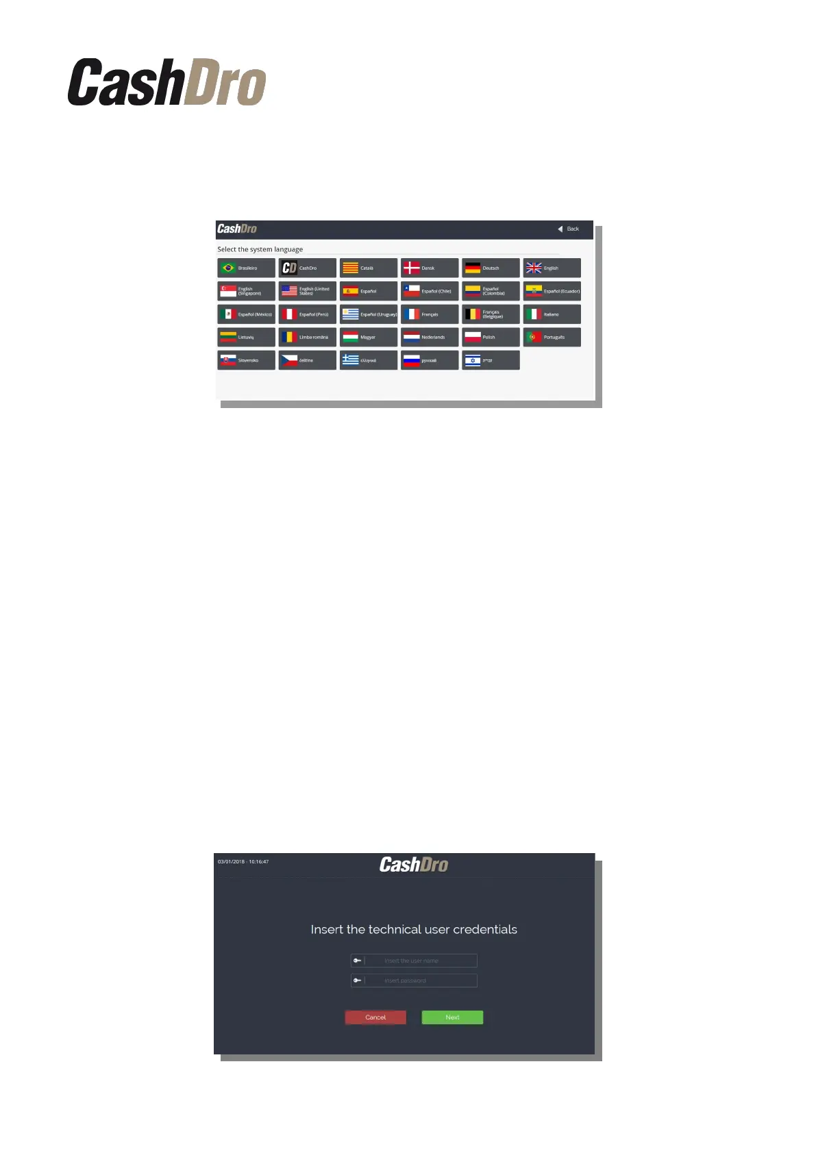 configured, English and the language “CashDro” that shows the labels of each text and is