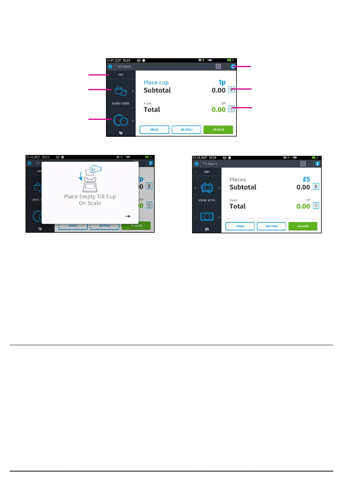 • Loose coins must be counted using the scoop or till cups.