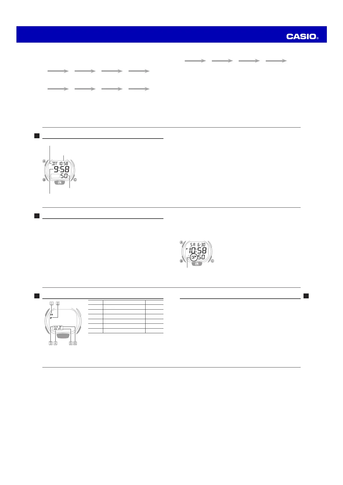 Timekeeping: Hour, minutes, seconds, p.m. (P), month, day, day of the week