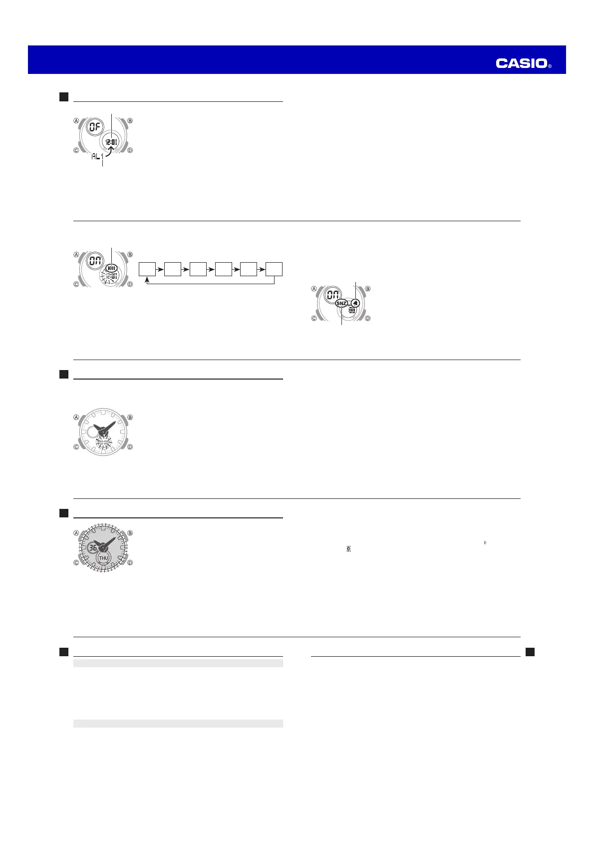 x The snooze alarm screen is indicated by SNZ, while the other alarm screens are