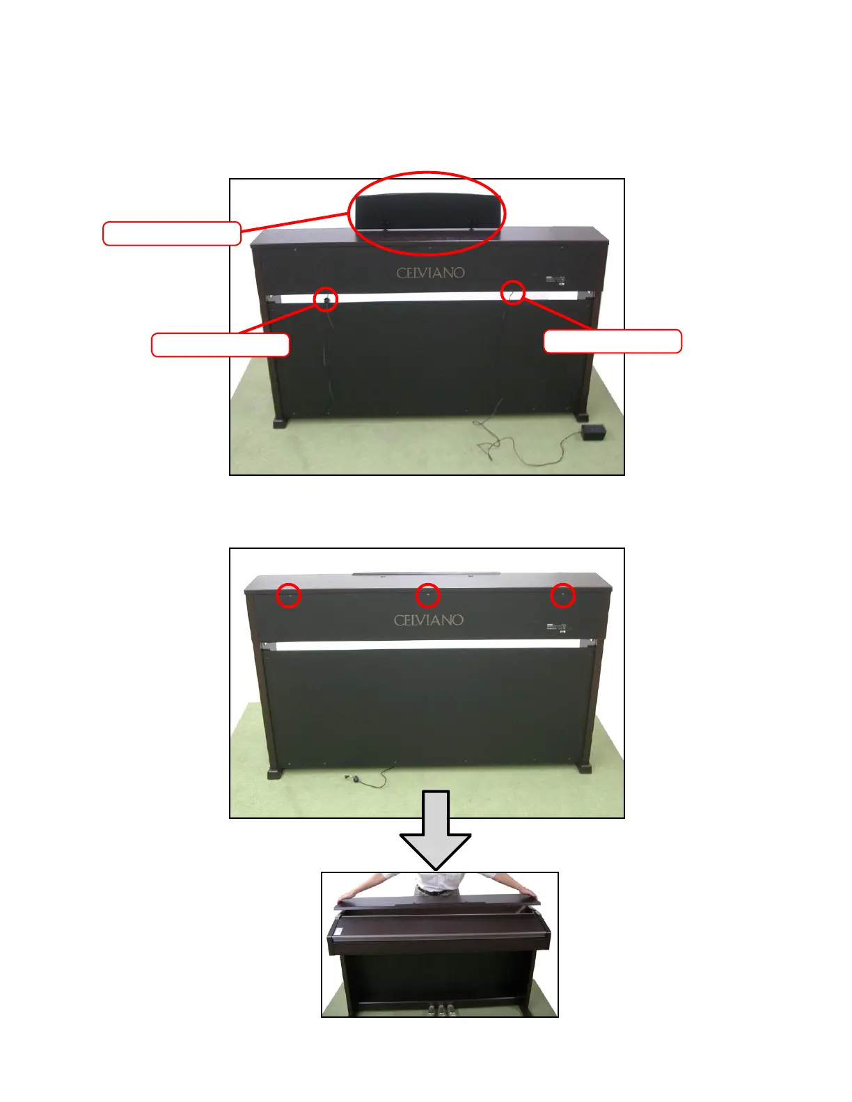 1. Remove the AC adaptor, Pedal cord and Music stand.