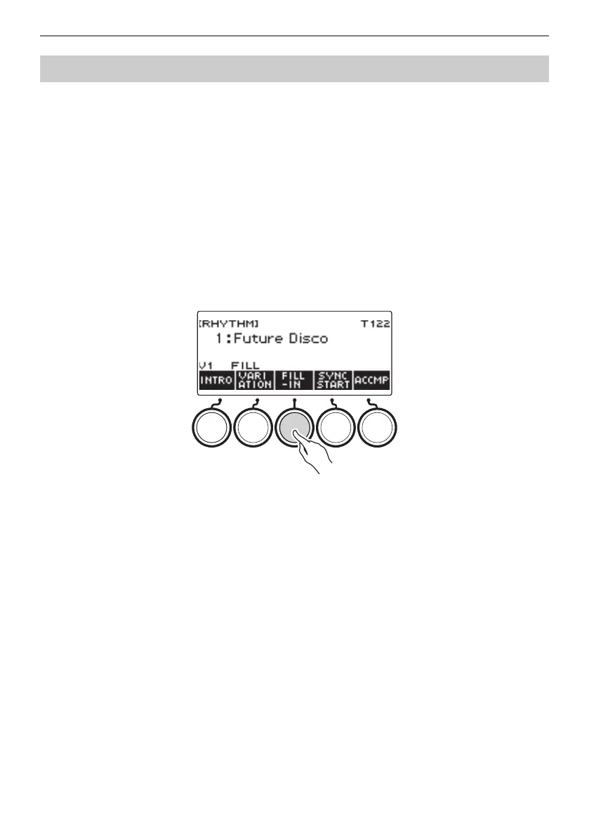 • To extend the fill-in into the next measure, keep FILL-IN depressed until rhythm play enters the