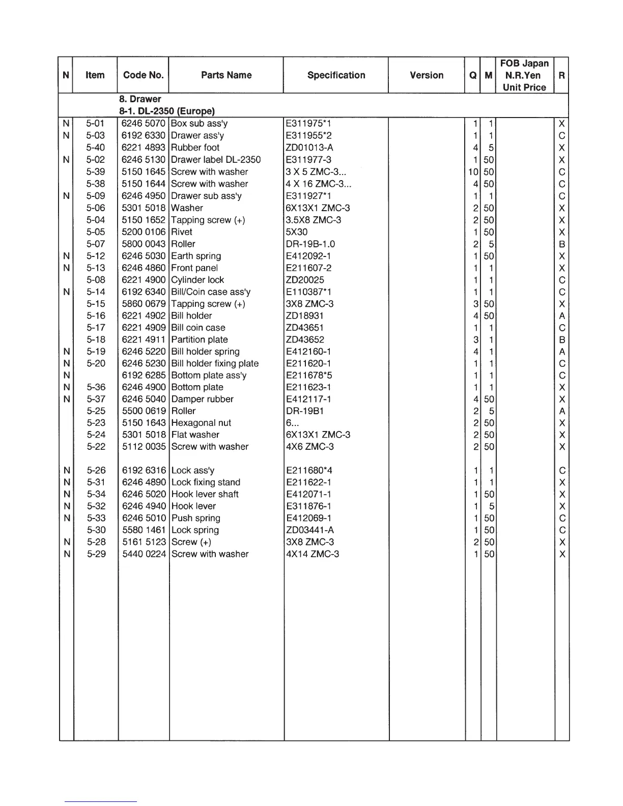 Casio CE-3700 - Parts List (cont.); Drawer Parts (DL-2350 Europe)
