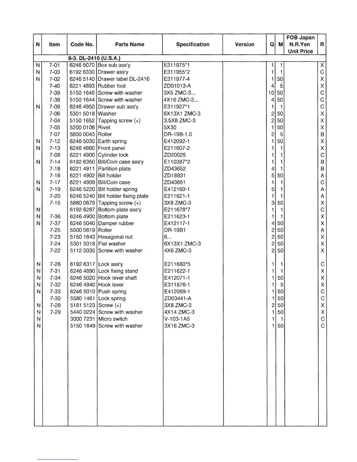 Casio CE-3700 - Parts List (cont.); Drawer Parts (DL-2416 U.S.A.)