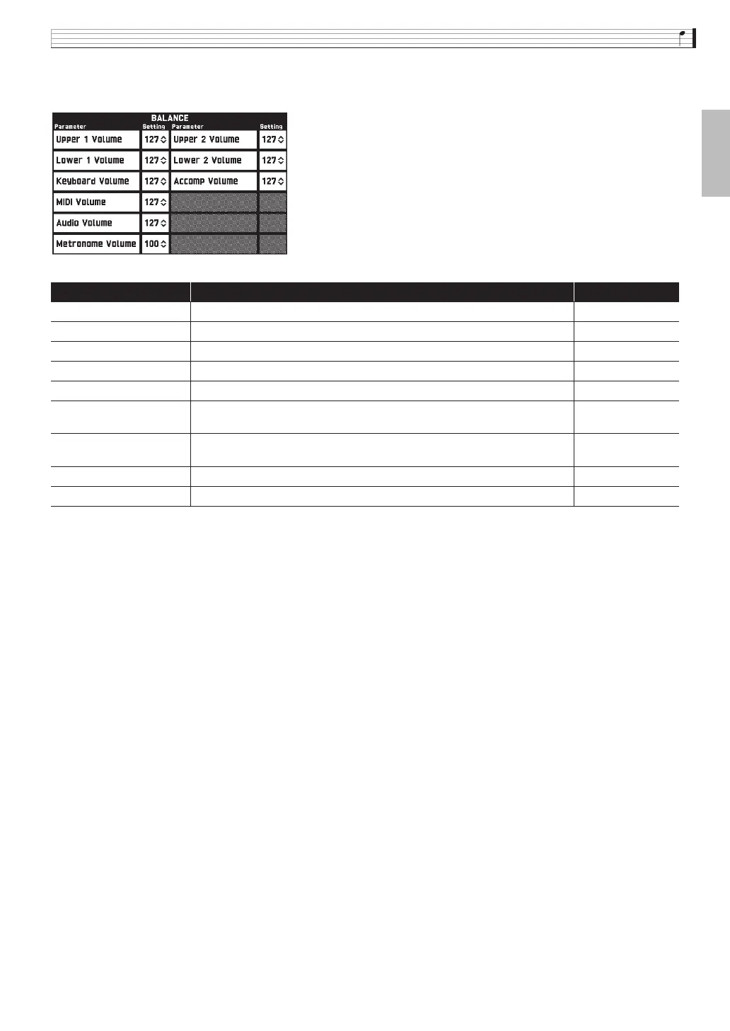Keyboard Volume Adjusts the volume levels of all parts that are controlled by the keyboard. 0 to 127