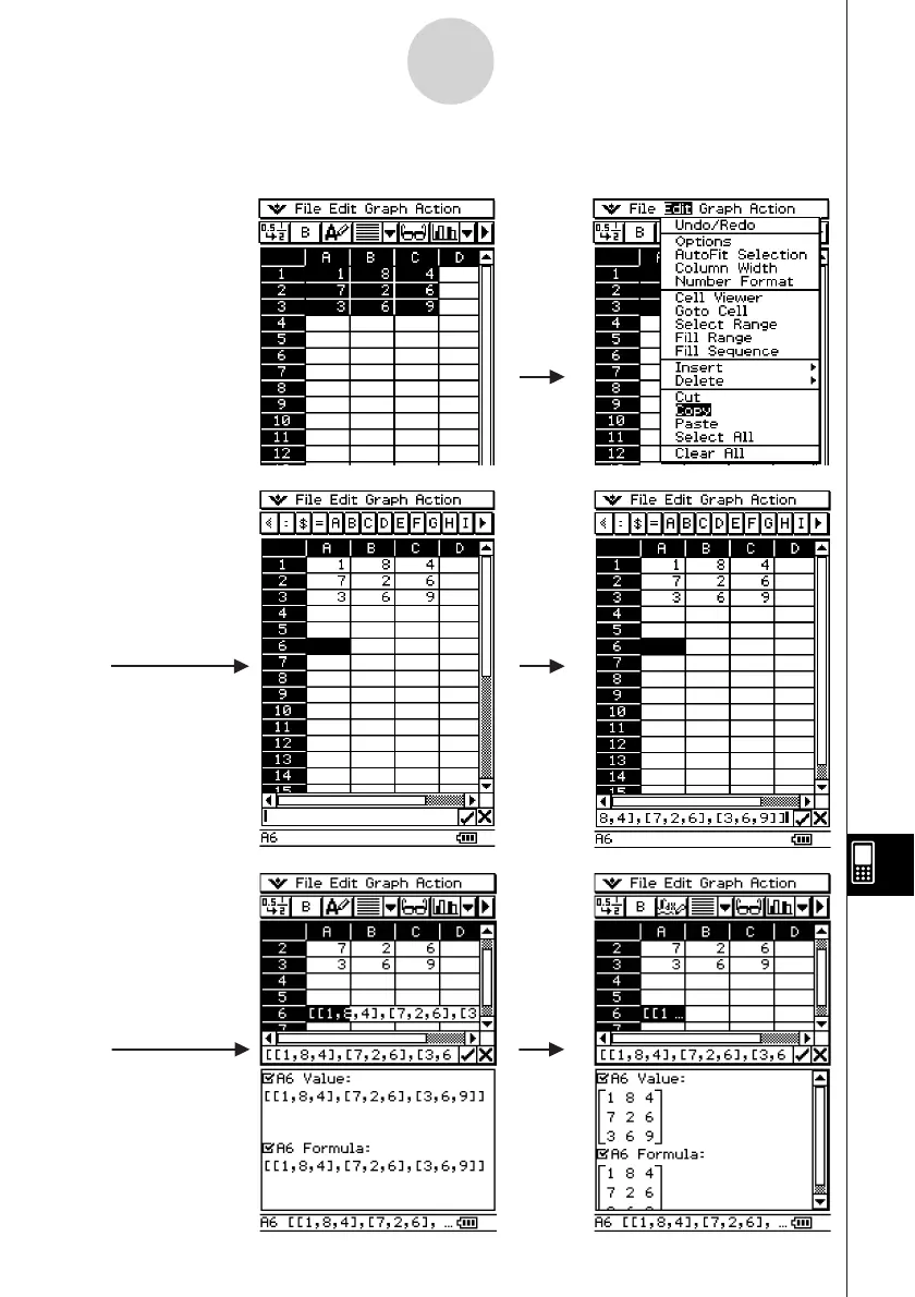 The following shows how cell data is converted to a matrix format when pasted into the edit
