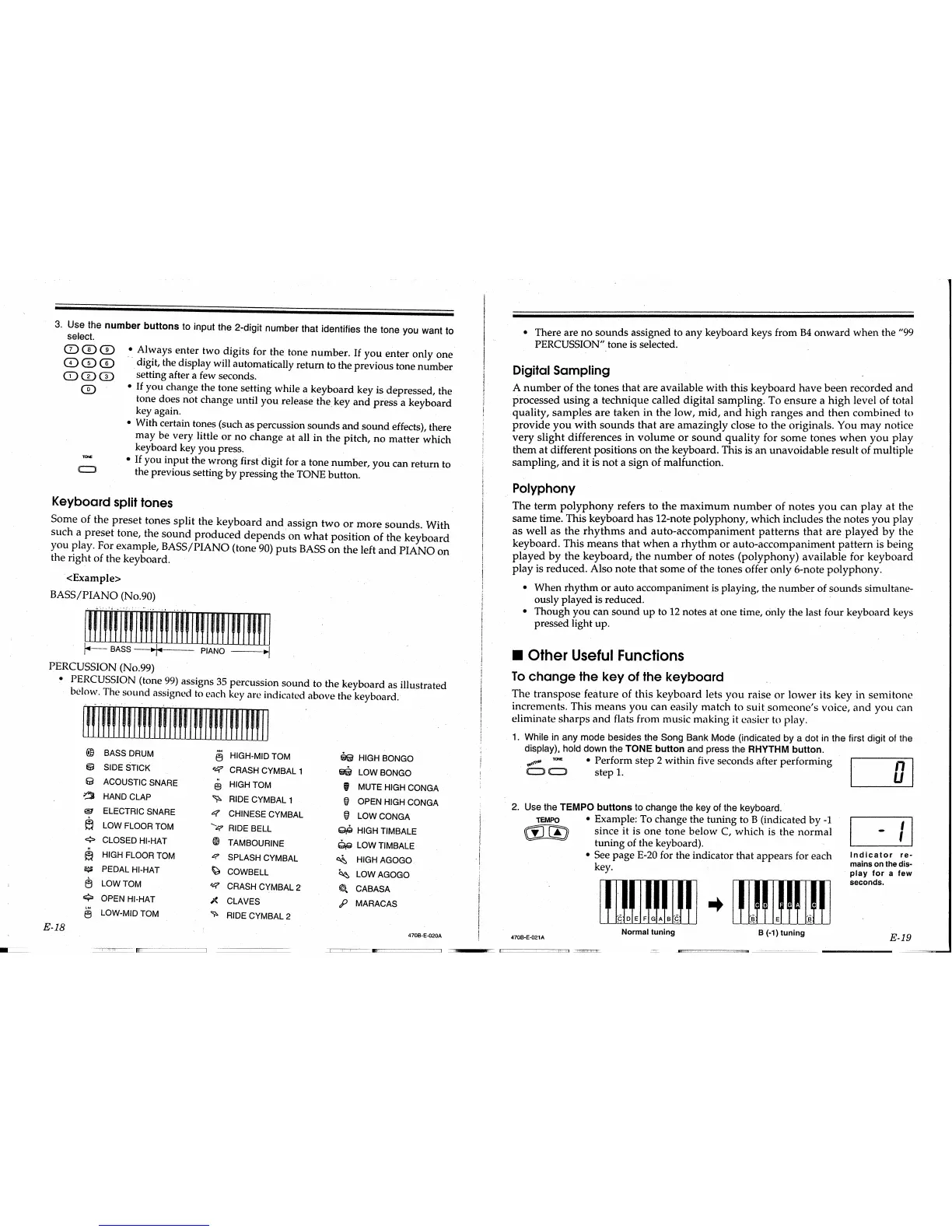 Casio CTK-560L - Keyboard Split Tone Functionality; Digital Sampling and Polyphony Details; Advanced Keyboard Functions; Changing Keyboard Key (Transpose)