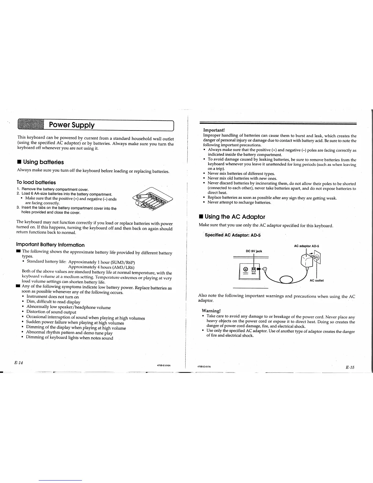 Casio CTK-560L - Power Supply Options; Using Batteries for Power; Important Battery Information; Using the AC Adaptor