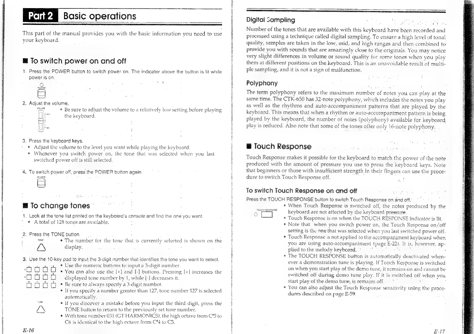 Casio CTK-650 - Part 2: Basic Operations; Powering On;Off and Volume; Selecting and Changing Tones; Touch Response Functionality