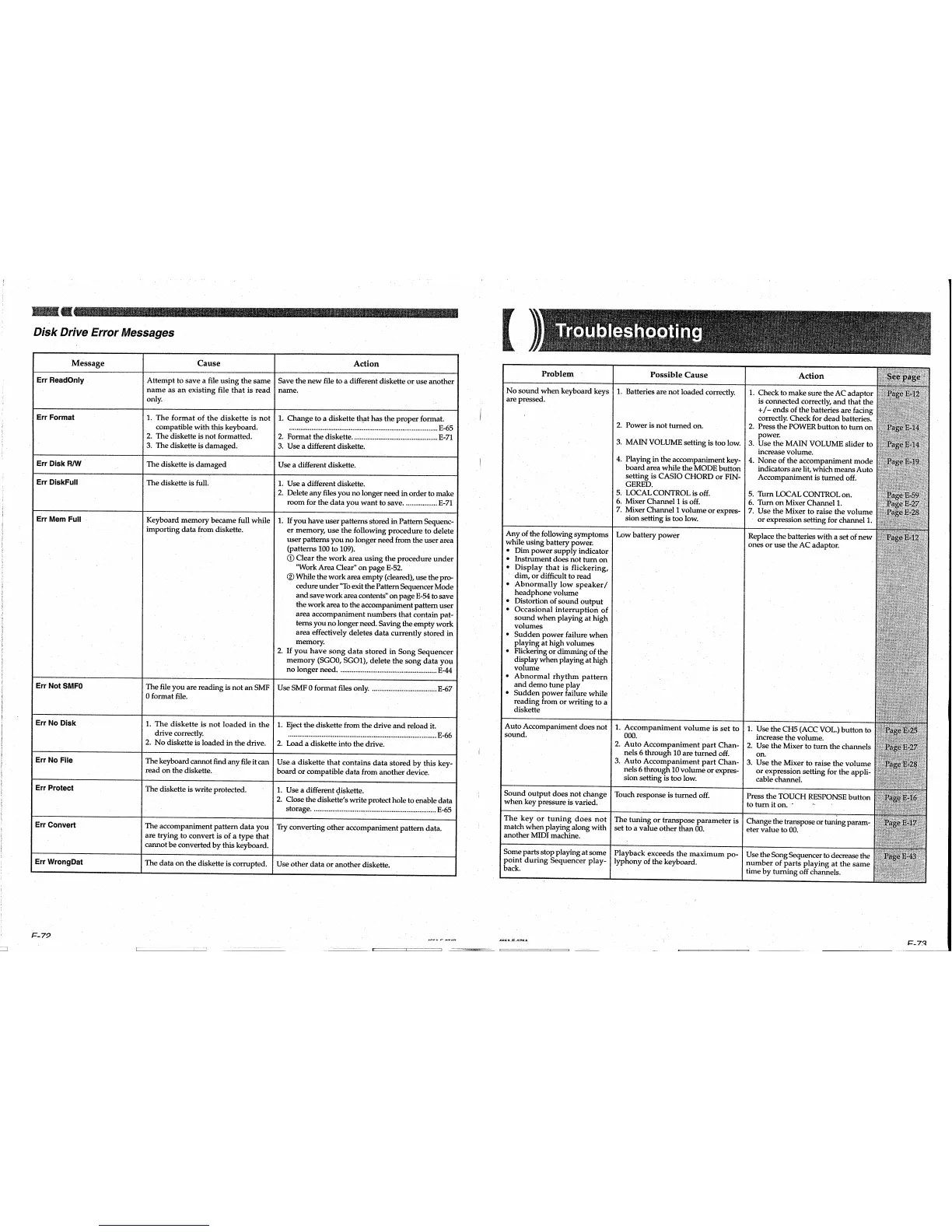 Casio CTK-811EX - Disk Drive Error Messages; Troubleshooting; No sound when keyboard keys are pressed.; Auto Accompaniment does not sound.
