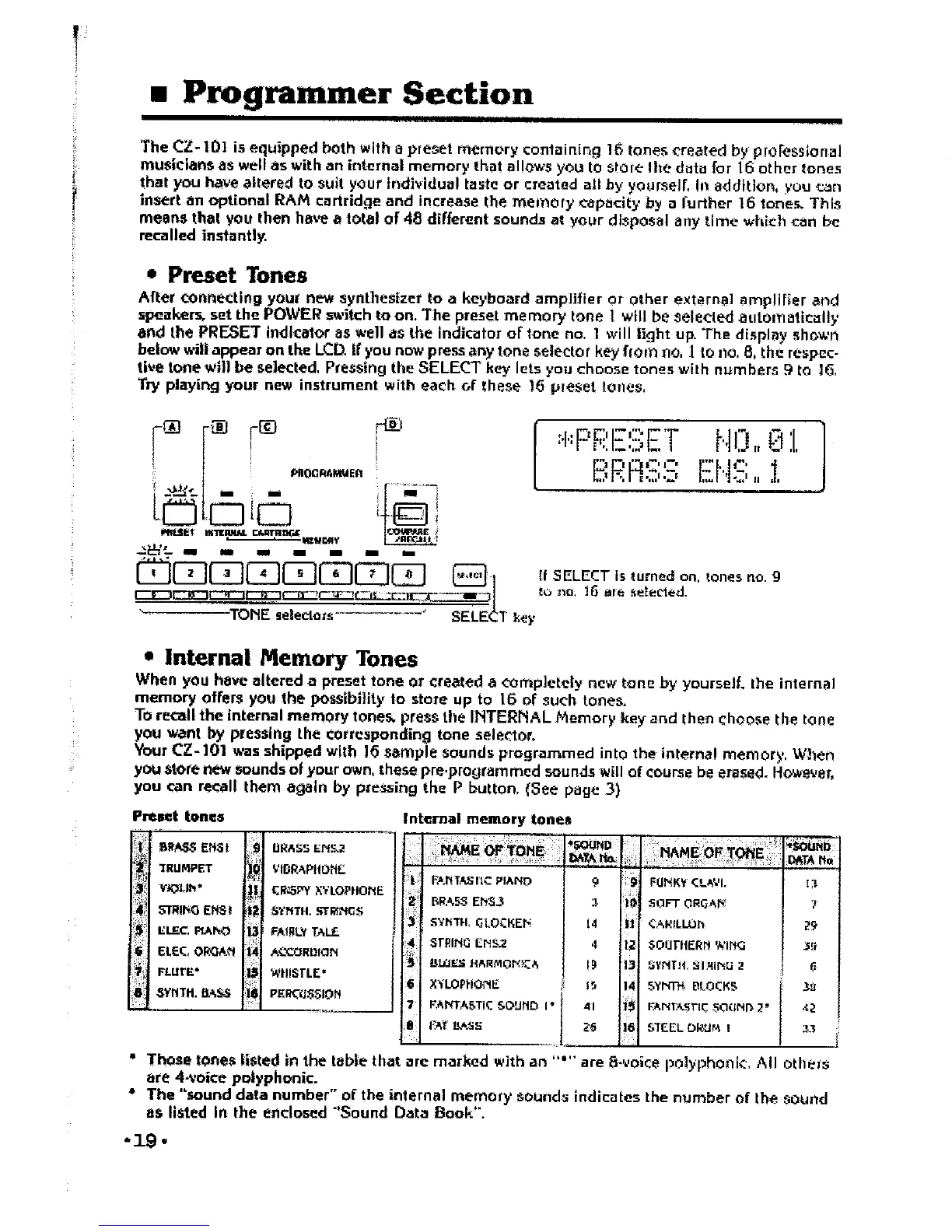 Casio CZ-101 Cosmo - Programmer Section; Preset Tones; Internal Memory Tones