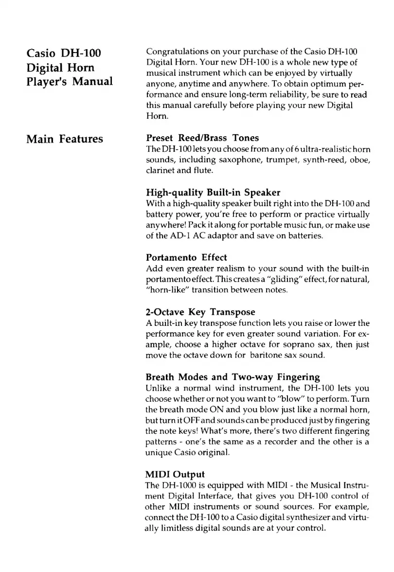 Casio DH-100 - Main Features; Preset Tones; Built-in Speaker; Portamento Effect
