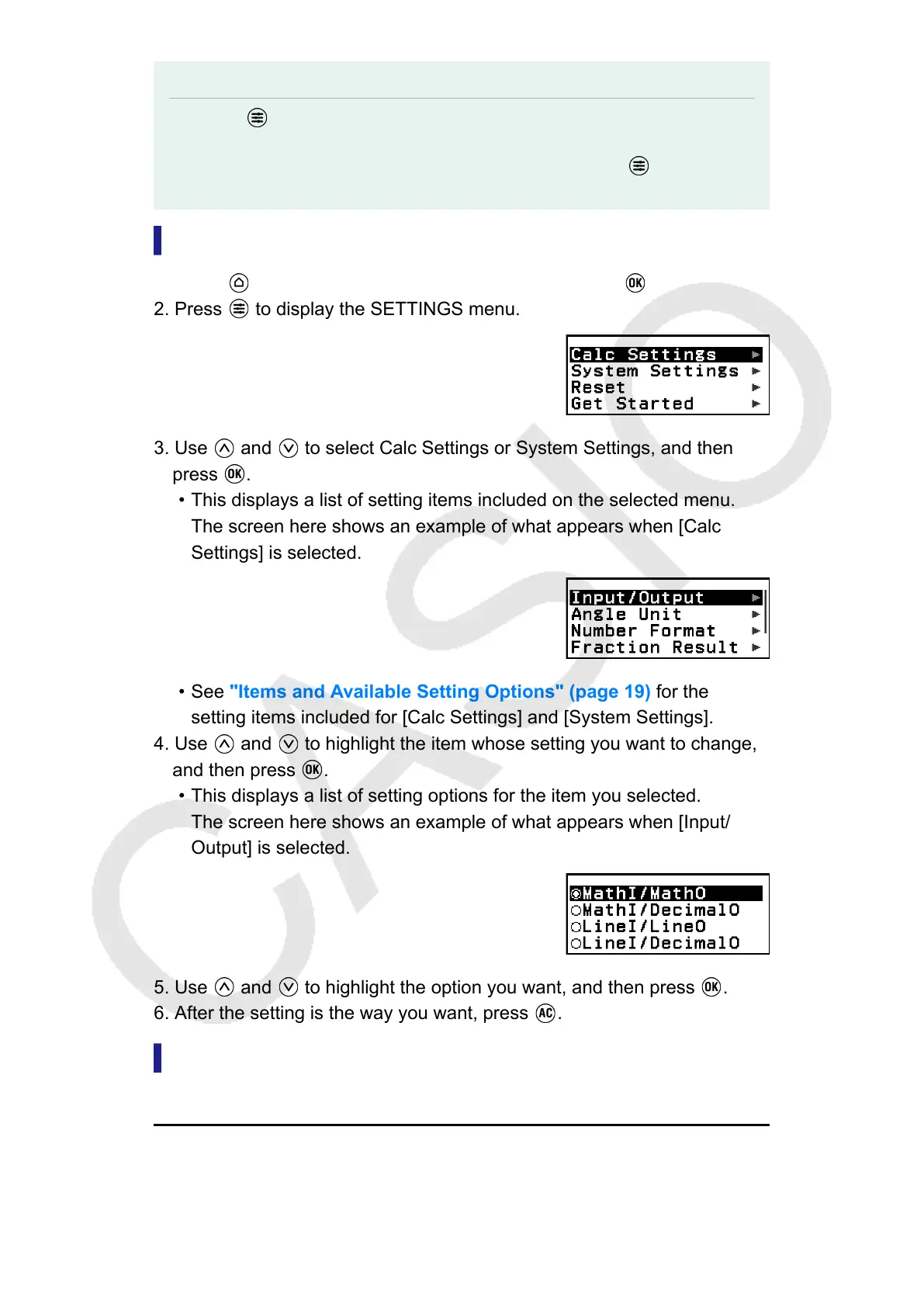 3. Use and to select Calc Settings or System Settings, and then