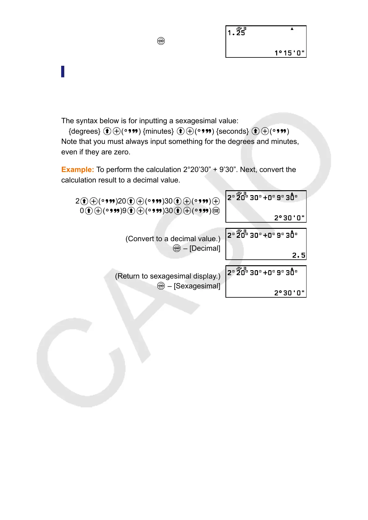Example: To perform the calculation 2°20’30” + 9’30”. Next, convert the