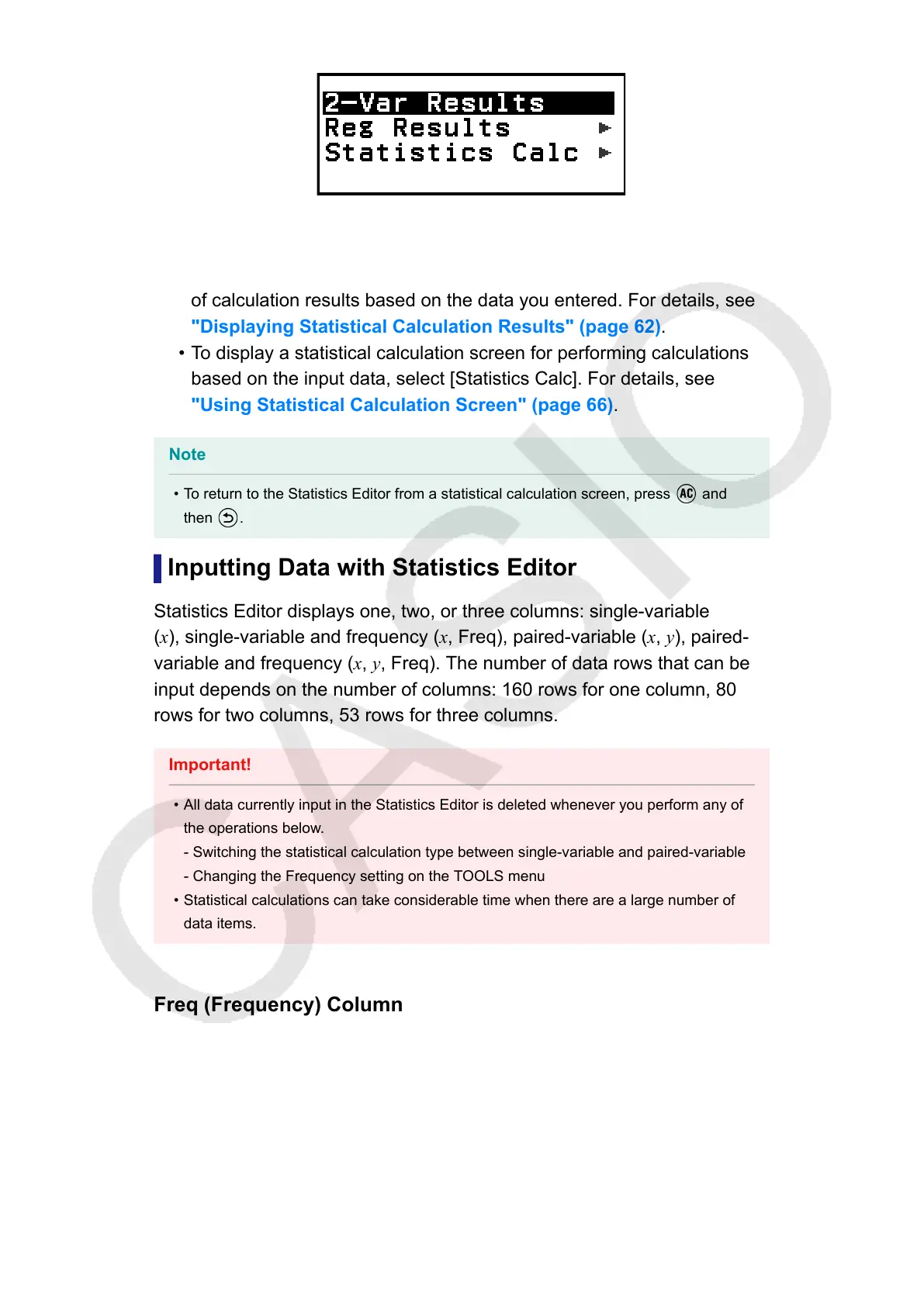 • All data currently input in the Statistics Editor is deleted whenever you perform any of