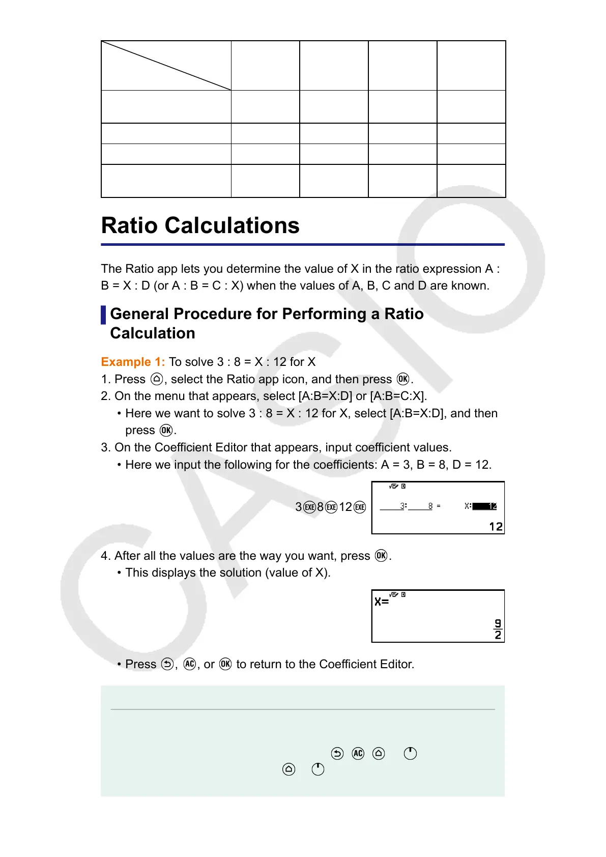 • Here we want to solve 3 : 8 = X : 12 for X, select [A:B=X:D], and then