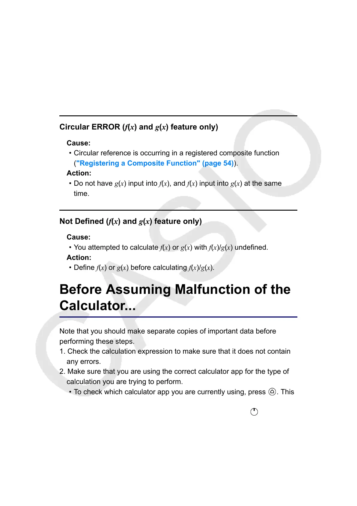 • You attempted to calculate f(x) or g(x) with f(x)/g(x) undefined.