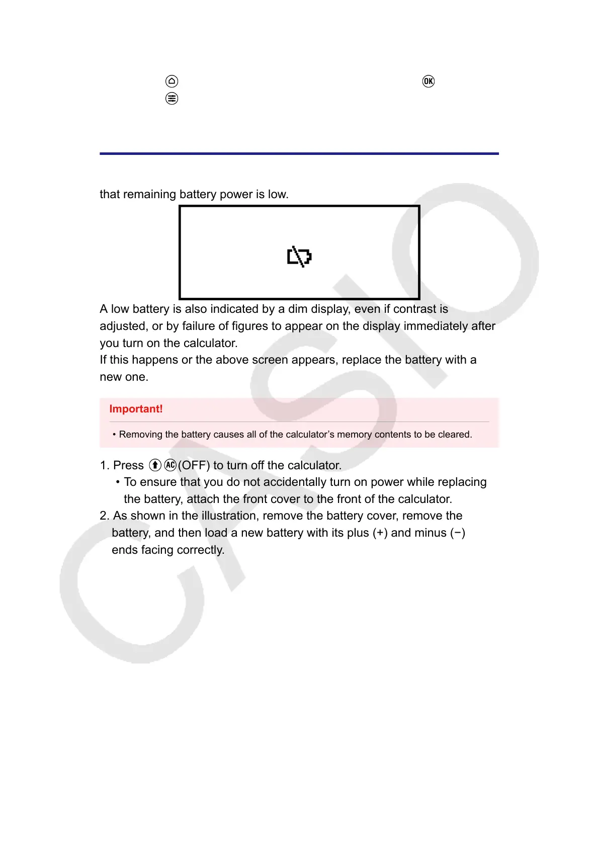 • Removing the battery causes all of the calculator’s memory contents to be cleared.