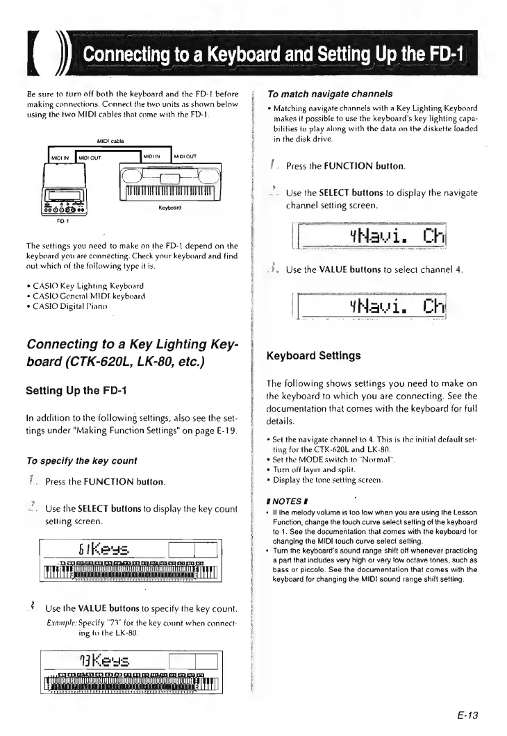 Casio FD-1 - Connecting Toa Keyboard and Setting up the; Connecting to a Key Lighting Keyboard (CTK-620 L, LK-80, Etc