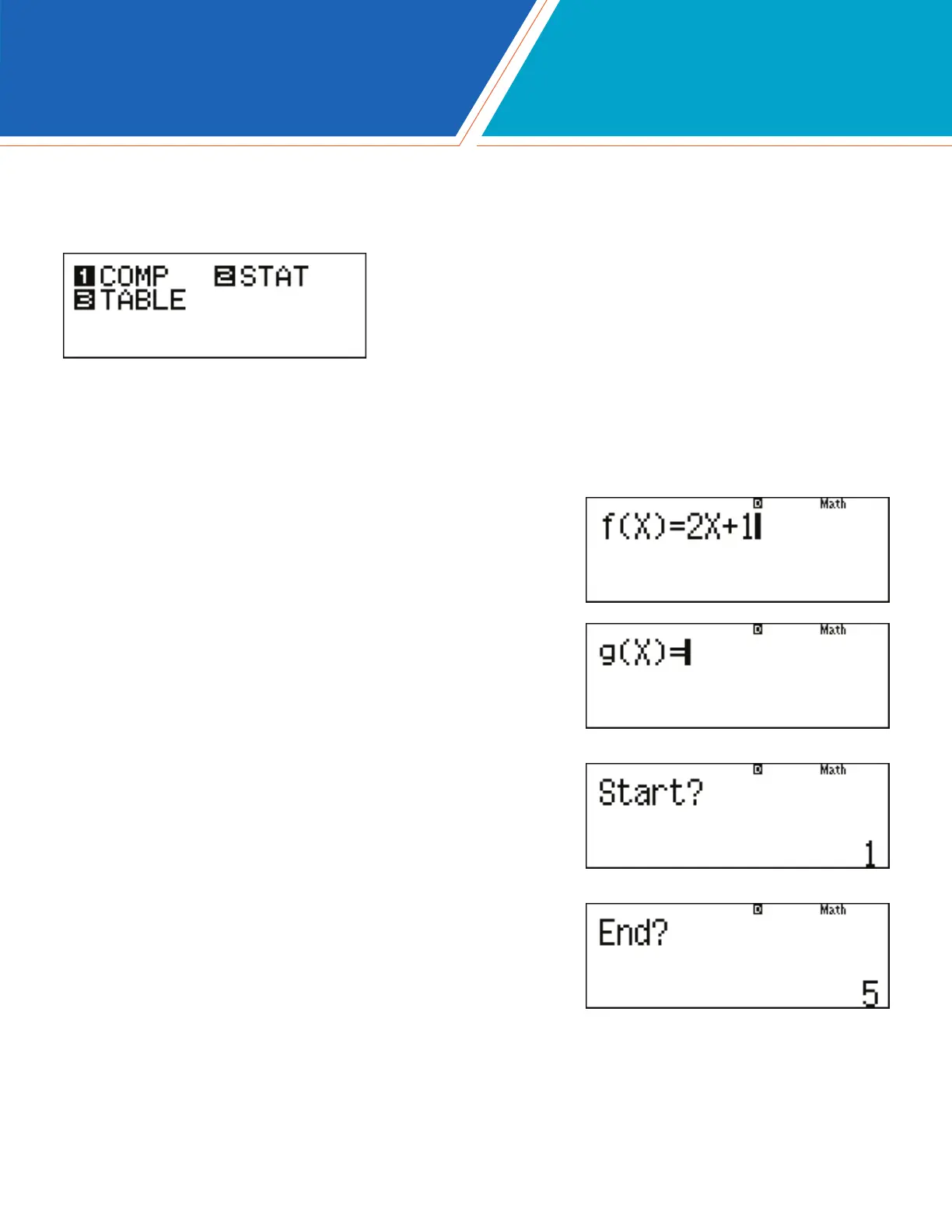 TABLE generates a number table based on one or two functions, entered as f(x) and/or g(x). Press