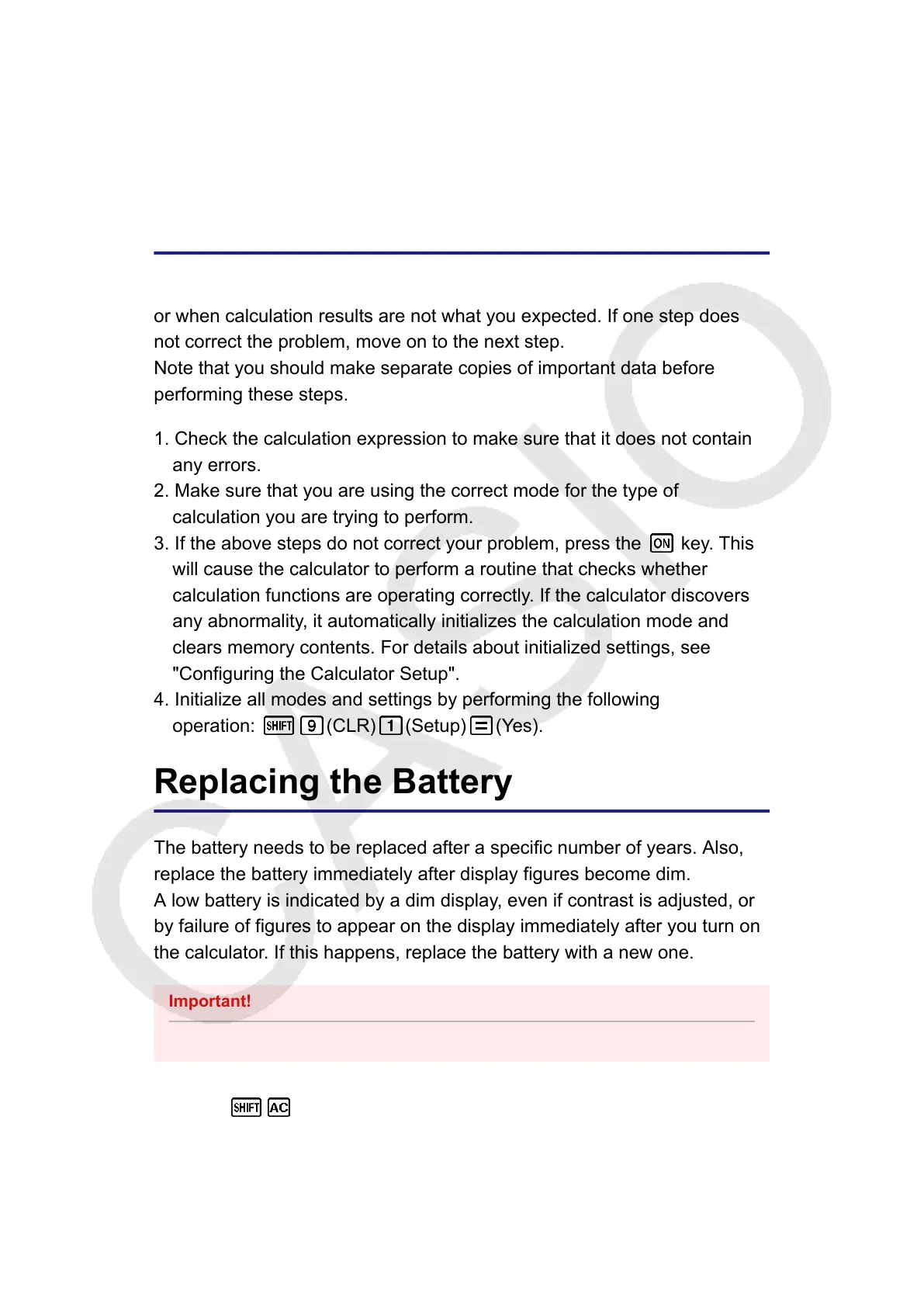 • Removing the battery will cause all of the calculator’s memory contents to be deleted.