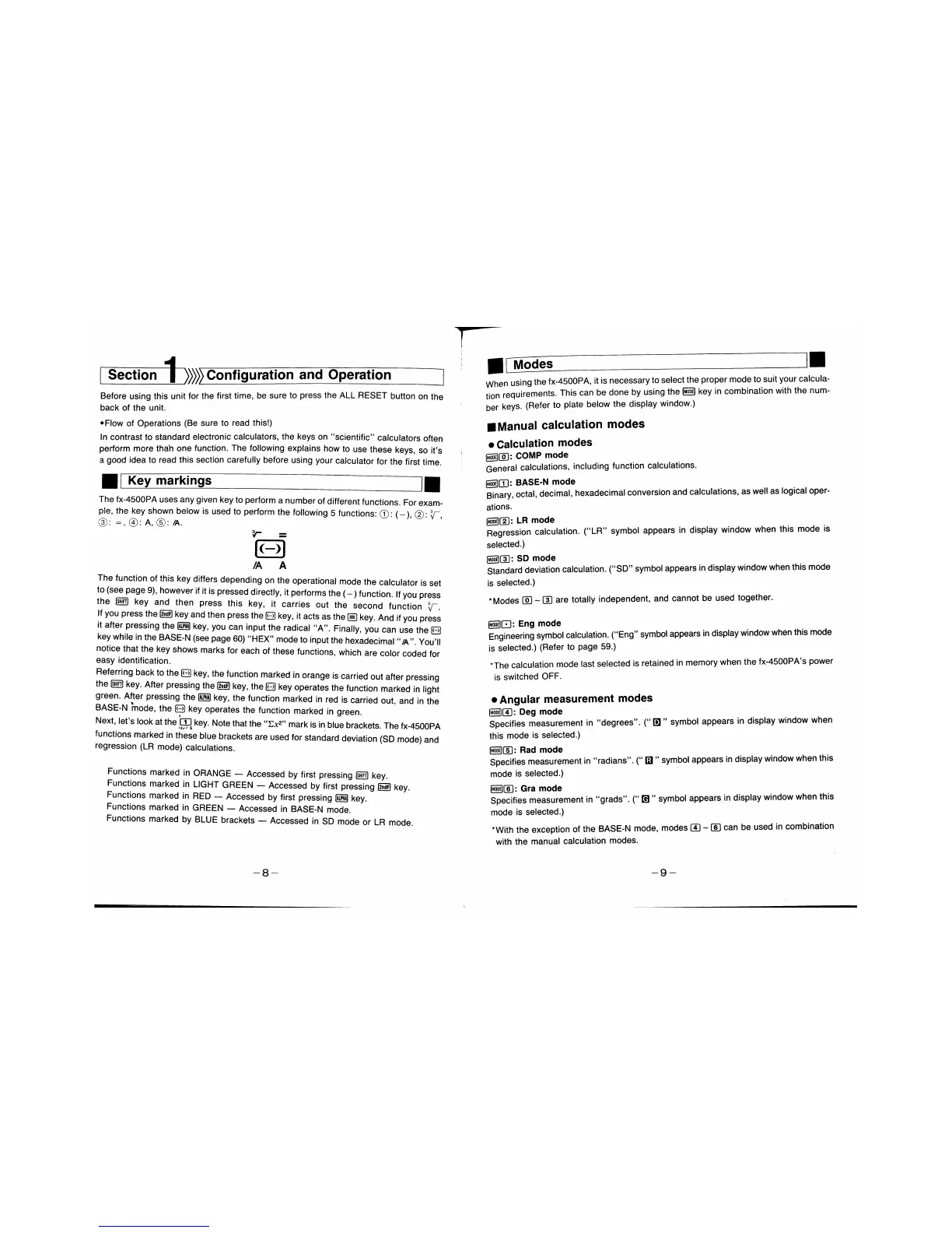 Casio fx-4500PA - Key Markings and Modes; Handling Precautions and Power; Nomenclature and Functions