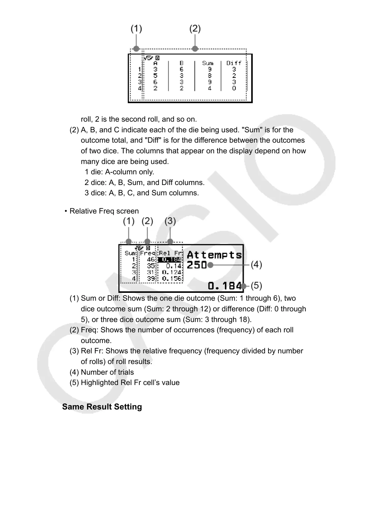 (1) Sum or Diff: Shows the one die outcome (Sum: 1 through 6), two