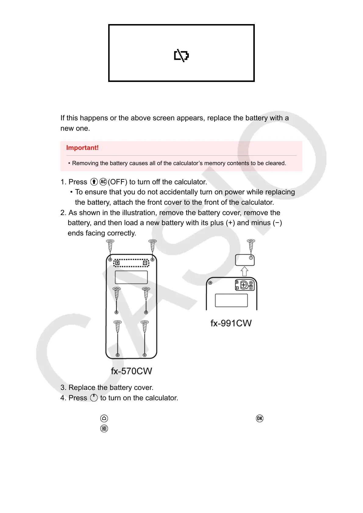 • Removing the battery causes all of the calculator’s memory contents to be cleared.