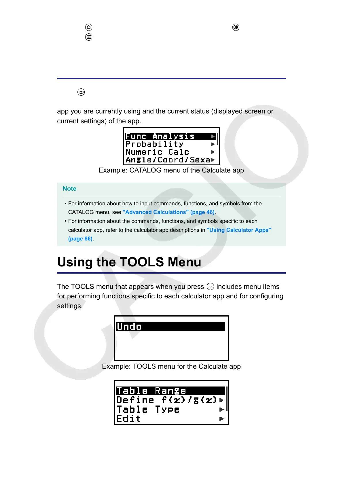 CATALOG menu, see "Advanced Calculations" (page 46).