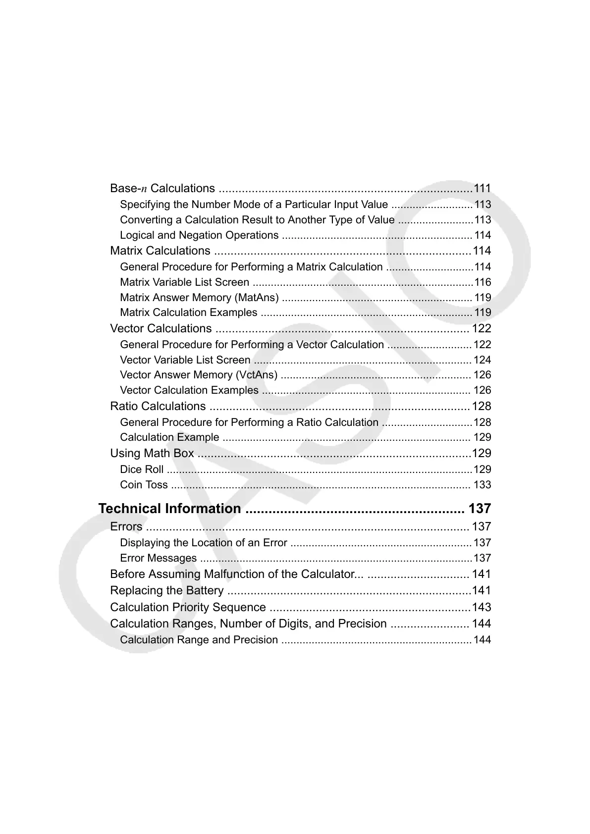 Before Assuming Malfunction of the Calculator... ............................... 141
