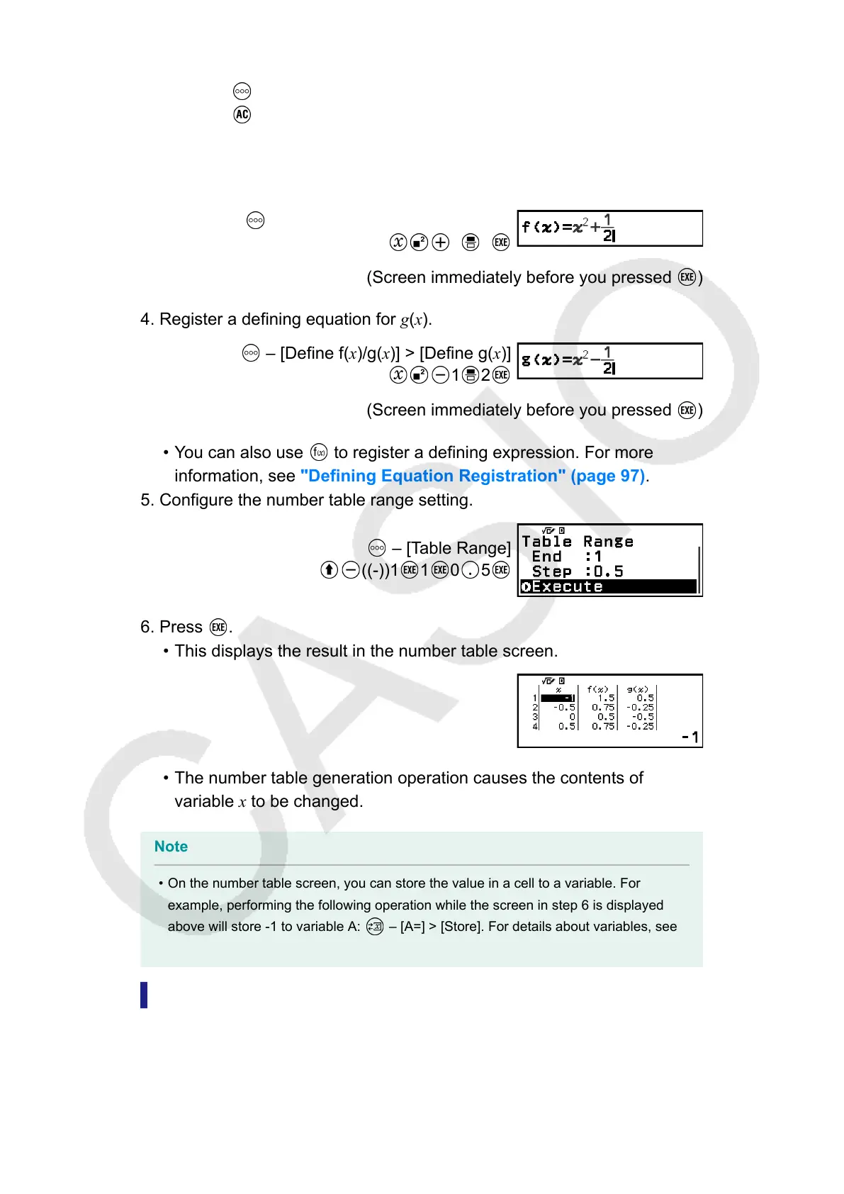 above will store -1 to variable A: – [A=] > [Store]. For details about variables, see