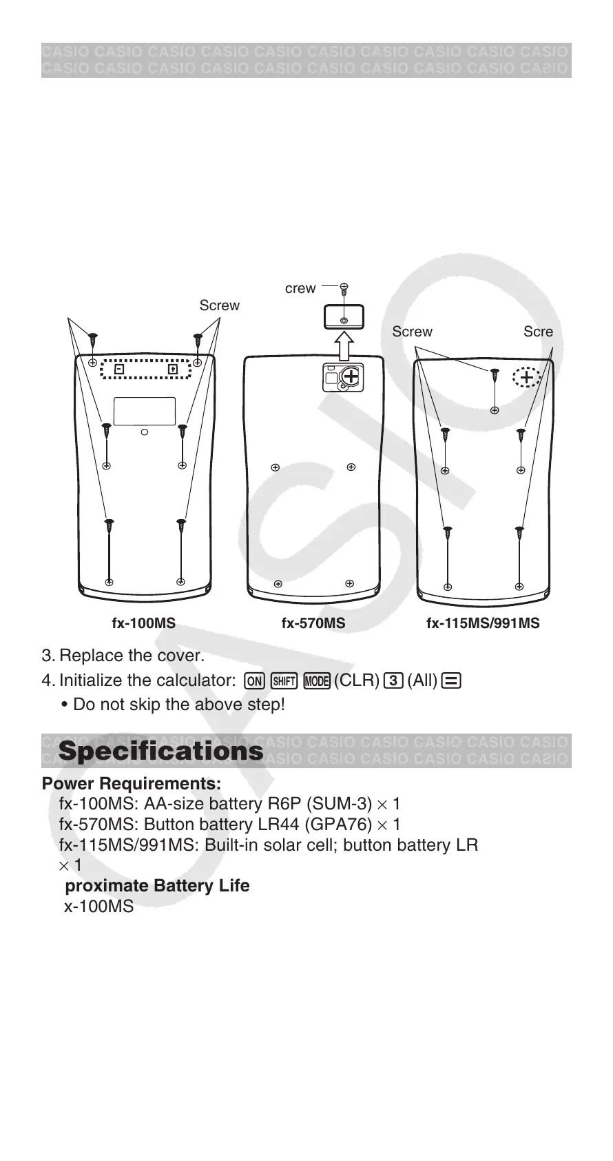 fx-115MS/991MS: Built-in solar cell; button battery LR44 (GPA76)