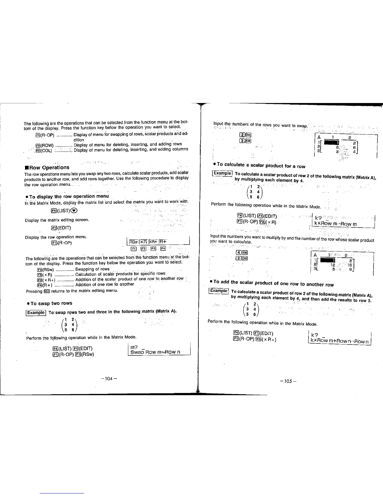 Casio FX-7700GE - Row Operations; To Display the Row Operation Menu; To Swap Two Rows; To Calculate a Scalar Product for a Row